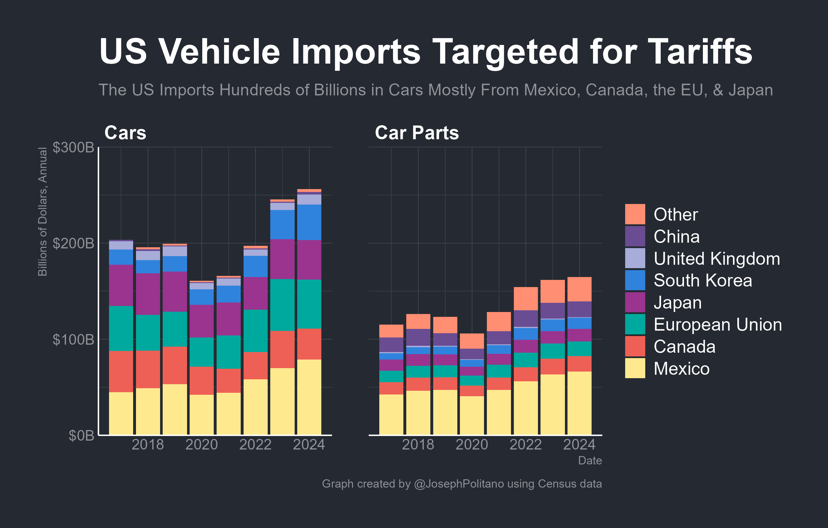 In any other administration, the announcement of 25% tariffs on cars & parts would be the single-largest economic story of the year—they currently hit more than $353B in US imports, having a larger economic effect than all of the tariffs implemented during Trump’s first term combined. These tariffs primarily affect imports from close American allies like the EU, Japan, & South Korea, who supply the majority of foreign-made cars to the United States. Yet the President won’t even spare the highly integrated North American supply chain, as tariffs currently apply to the non-US content in Mexican and Canadian-made vehicles.
