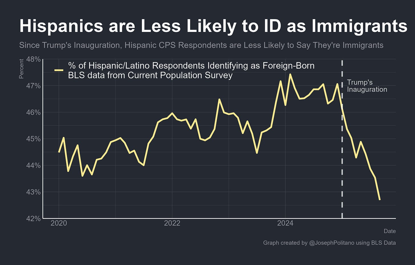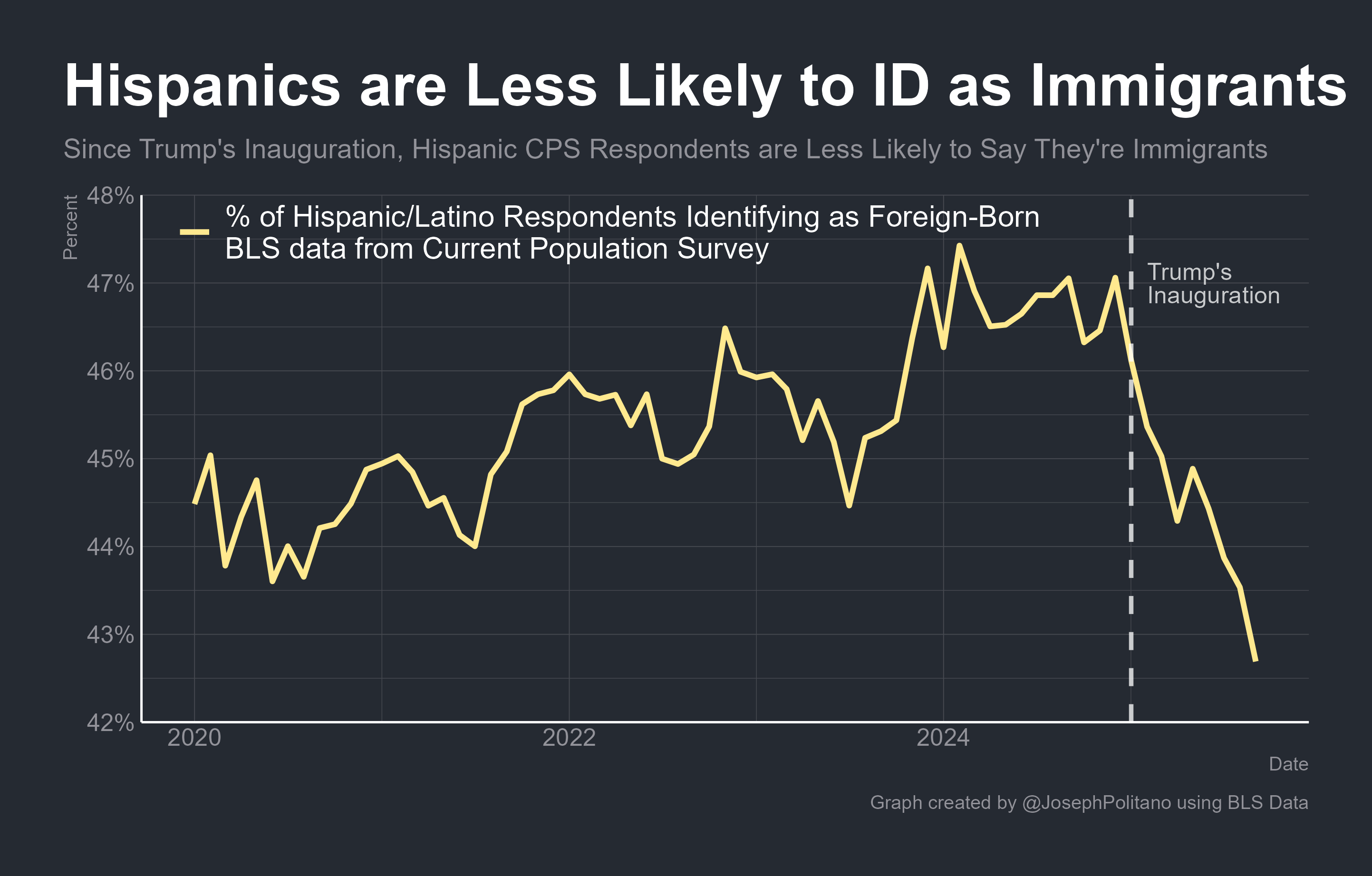 That’s a microcosm of what’s been happening in official US data this year—the weighted share of Hispanic CPS respondents claiming to be immigrants has dipped by more than three percentage points, hitting the lowest level in decades. The share of Black respondents claiming to be foreign-born has dropped by roughly two percentage points, and the share of Asian respondents has dropped one percentage point.