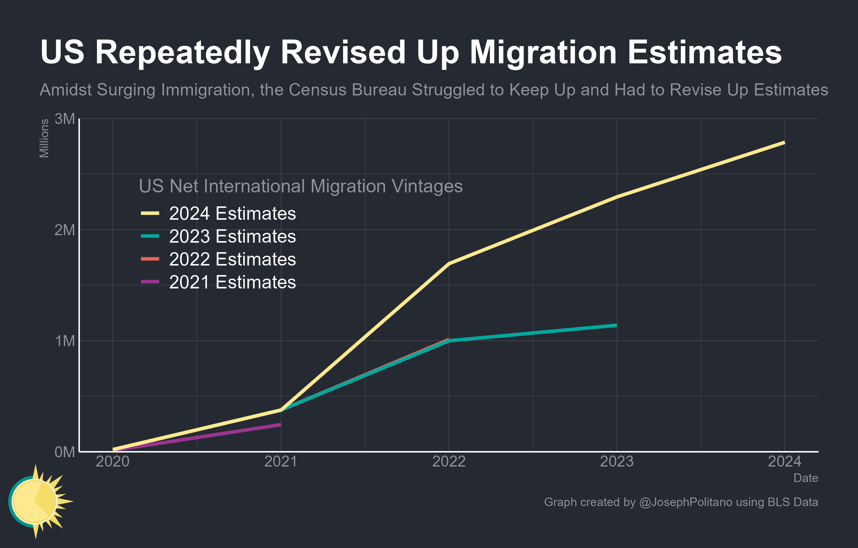 Previously, this wasn’t much of a problem—America is a much larger country with a much lower immigration rate than Canada, and population flows tended to be stable enough that shifts in immigration policy were not macroeconomically significant. That changed during the pandemic, as COVID-related travel restrictions caused an unprecedented slowdown in immigration flows at a time when regular data collection was extremely difficult. Immigration subsequently rebounded to the highest level in decades, but that 2021-2023 immigration surge did not show up in official data for years because so many of the immigrants went through asylum or refugee systems that were not well-tracked by population statistics.