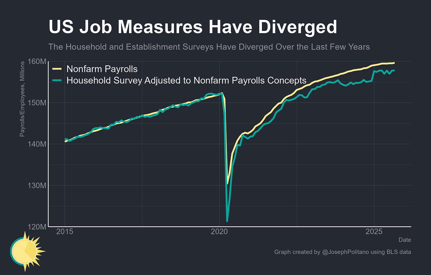 Yet answering how much CPS is overstating the immigrant decline is nearly impossible at this point. While the lack of massive payroll declines is enough evidence to know the CPS immigrant counts are inaccurate, it’s also impossible to calculate the true decline in immigration by working backwards purely from payroll data. The majority of recent immigrants are legal asylees with work permits, and stripping those asylees of legal status will show up as declines in payroll data—yet many legal and undocumented immigrants are self-employed, agricultural workers, contributing to family businesses, or get paid under-the-table in ways that make payroll data unable to fully count them. However, even looking at CPS Household Survey data adjusted to exclude those types of workers and therby match nonfarm payroll concepts shows a persistent, significant gap between the two measures that did not exist pre-COVID. That means either official population counts are (still) underestimating the size of recent immigration flows, payroll counts are underestimating the speed of job losses, or some combination of the two.