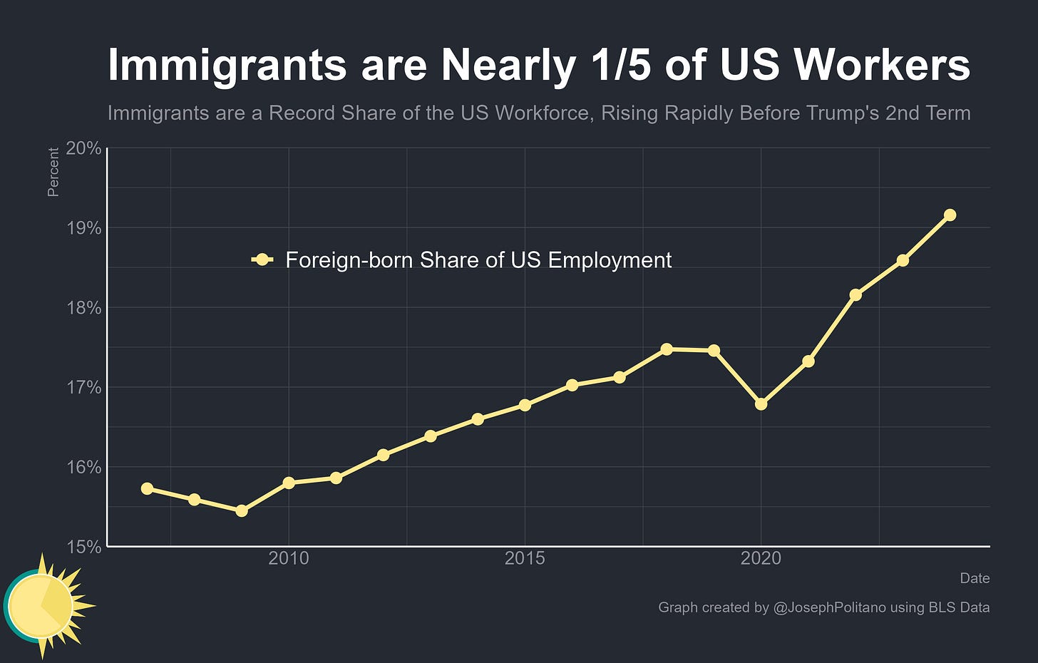 From that data, it’s extremely clear that working-age native-born Americans have not seen any substantial increase in employment rates over the last year—in fact, the share of them with jobs has actually inched down compared to 2024. Employment rates among immigrants have decreased slightly more than for native-born Americans, but the decline is also only marginal.