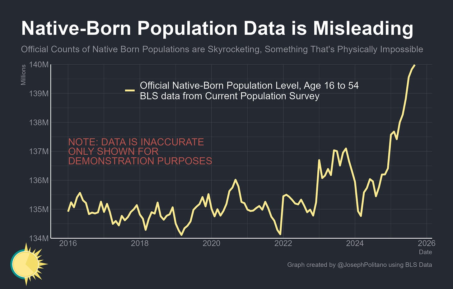 Yet because aggregate population figures are unchangeable constants in between their yearly benchmarkings, this means the same DHS figures that show a decrease in immigrants also show a massive increase in native-born adult populations. That increase is flatly impossible, as we have great records of US birth/death rates and know that 6M extra full-grown adults could not have appeared in the last few months. Thus, when the White House brags that “Over the past year, more than 2.5 million native-born Americans gained employment”, this is simply not the case—the share of native-born Americans with jobs has not budged, the US just erroneously thinks there are more native-born Americans because immigrants aren’t answering surveys. To return to our small town example, it’s as if you determined the population was 1000 at the start of the year and saw the immigrant count drop by 100 and thus presumed 100 more native-born residents appeared out of nowhere.
