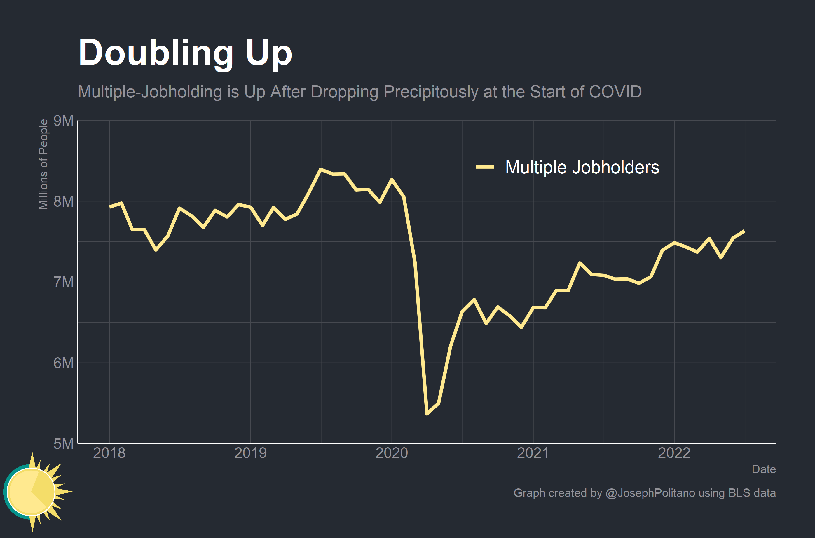 Multiple jobholding fell dramatically at the start of COVID—dropping more than 30% in the first few months of 2020 alone. Since then, it has slowly rebounded and now sits at 7.6 million—more than 90% of pre-pandemic levels. Since March alone, the estimated number of multiple jobholders increased more than 260,000—although this data is relatively volatile.