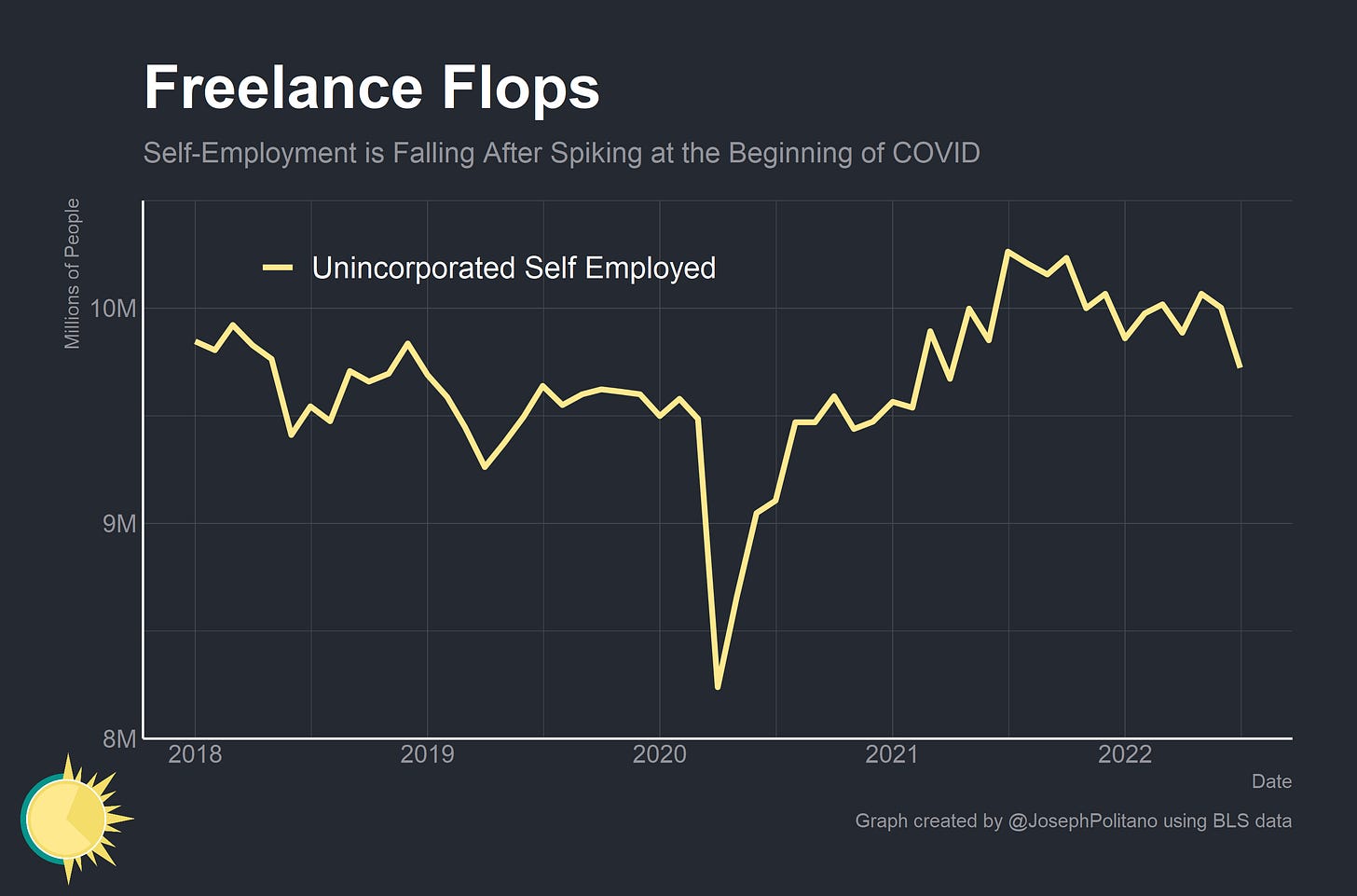 Self-employment, on the other hand, recovered rather rapidly after the initial COVID shock and actually reached a post-Great-Recession high in late 2021. Since then the number of unincorporated self-employed workers has begun to slide back down to pre-pandemic levels, with their number dropping 300k since March alone.