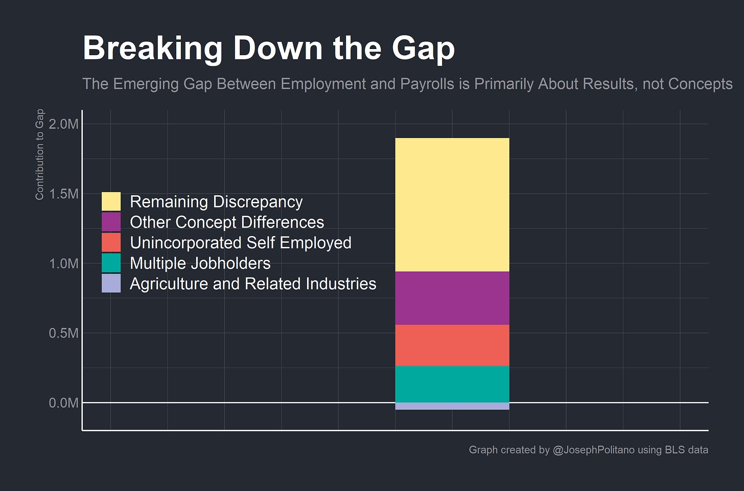 Also, the multiple-jobholding and self-employment data used to explain part of the gap is notoriously unreliable. Multiple-jobholding data from the household survey does not seem to match with the extremely comprehensive employer administrative data; in other words people do not seem to consistently report their second jobs on the household survey. Self-employment data is also unreliable; a lot of workers who are technically self-employed sometimes think they are officially payroll employees and the questionnaires struggle to capture the realities of self-employment.