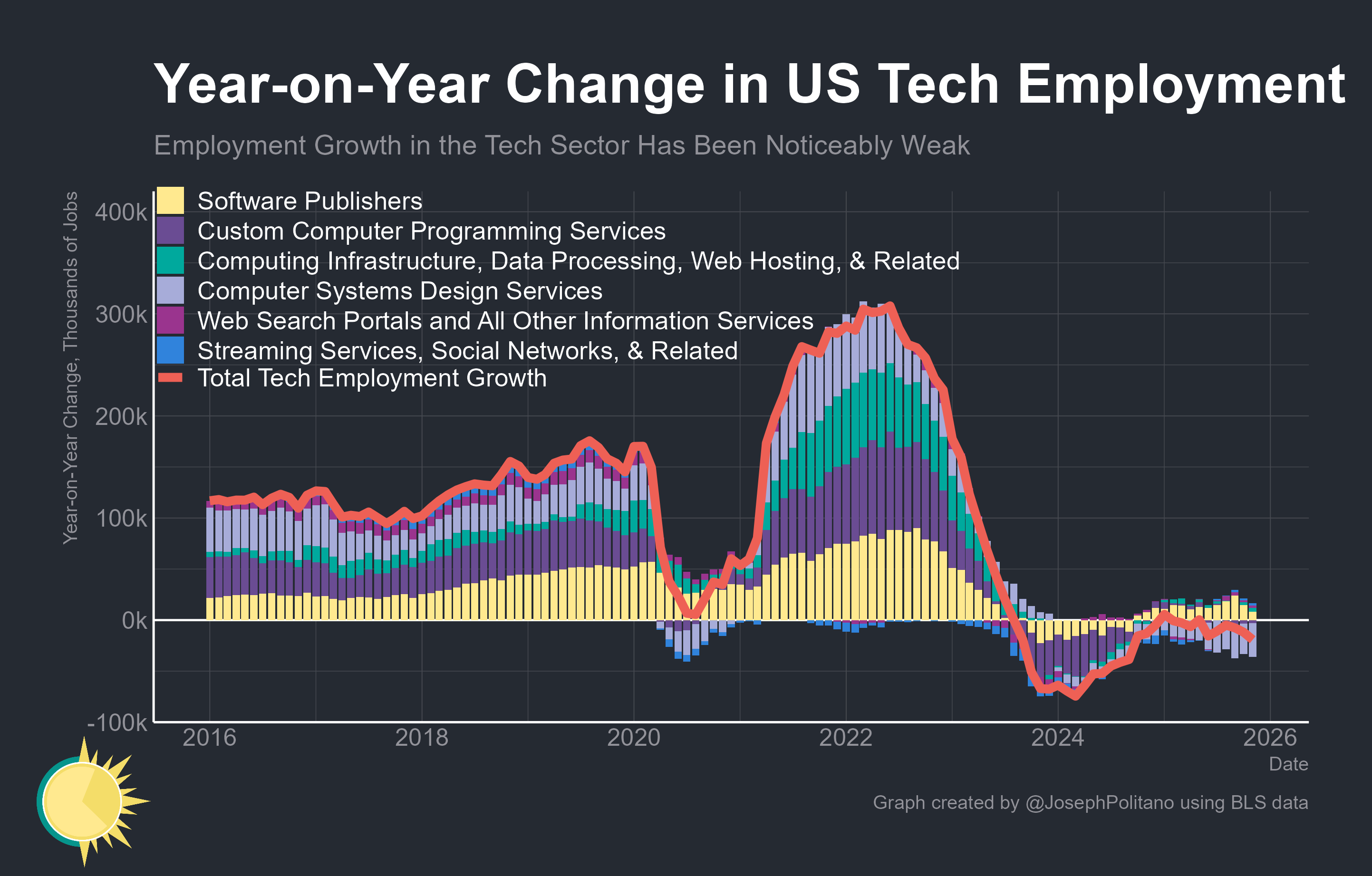 Finally, the tech sector labor market remains extremely weak, with employment shrinking by more than 19k over the last year and down roughly 100k since late 2023. That’s not as bad as the worst of the 2024 tech job market, but it is much worse than the 2022 boom or any period during the 2010s. At least during the 2008 financial crisis, it took only just over a year before tech employment began growing again—today, employment continues falling nearly three years after the beginning of the tech-cession. If this decline persists through 2026, it will beat the dot-com bust for the longest period of tech job market losses in American history.
