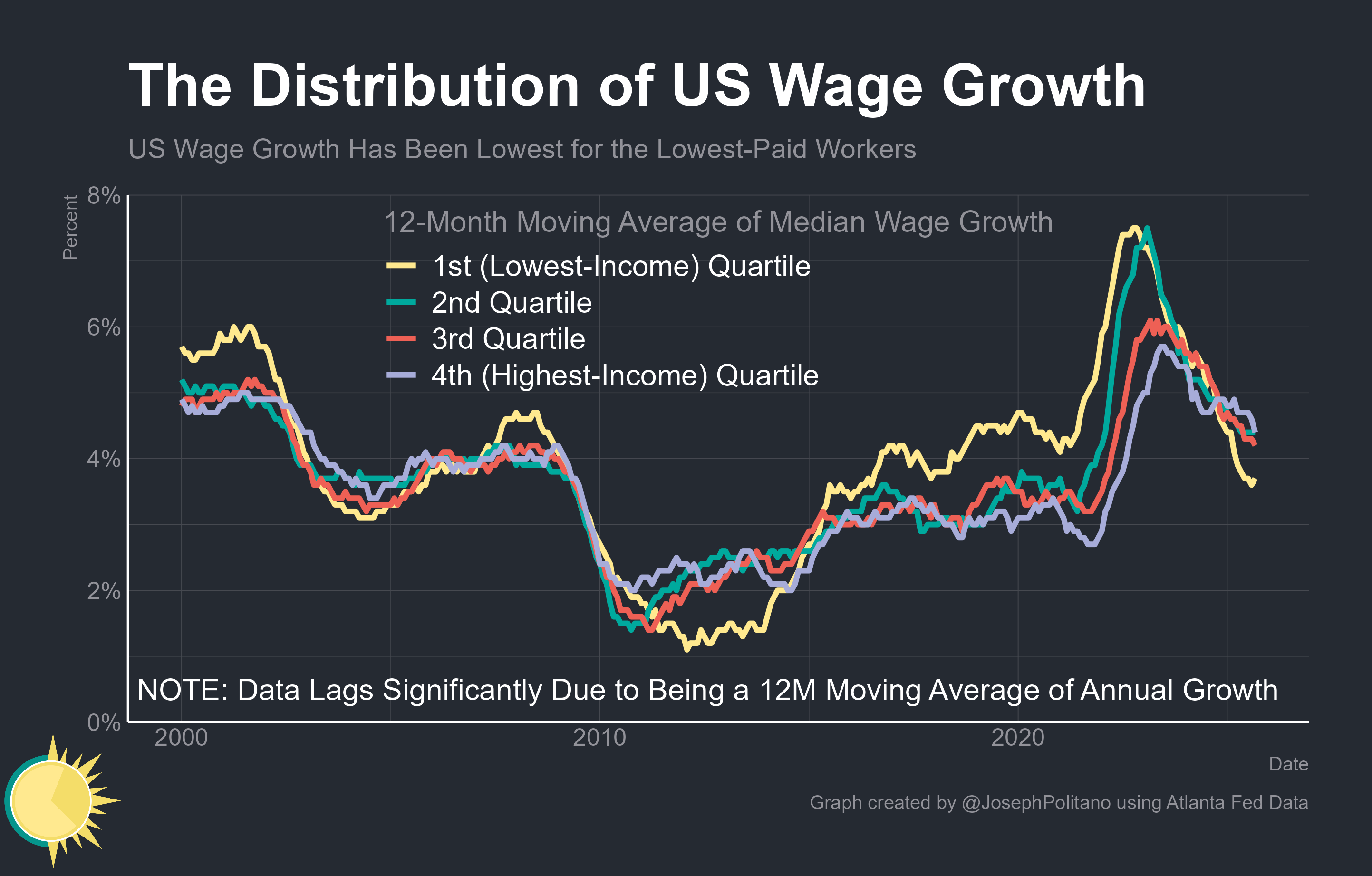 Yet wage growth for these lowest-paid workers has ground to a halt over the last two years, and they are now seeing much lower raises than their higher-paid counterparts. In fact, this is now the largest gap in wage growth favoring high earners since the early 2010s, showing just how hard today’s “no-hire” labor market has hit low-income workers.
