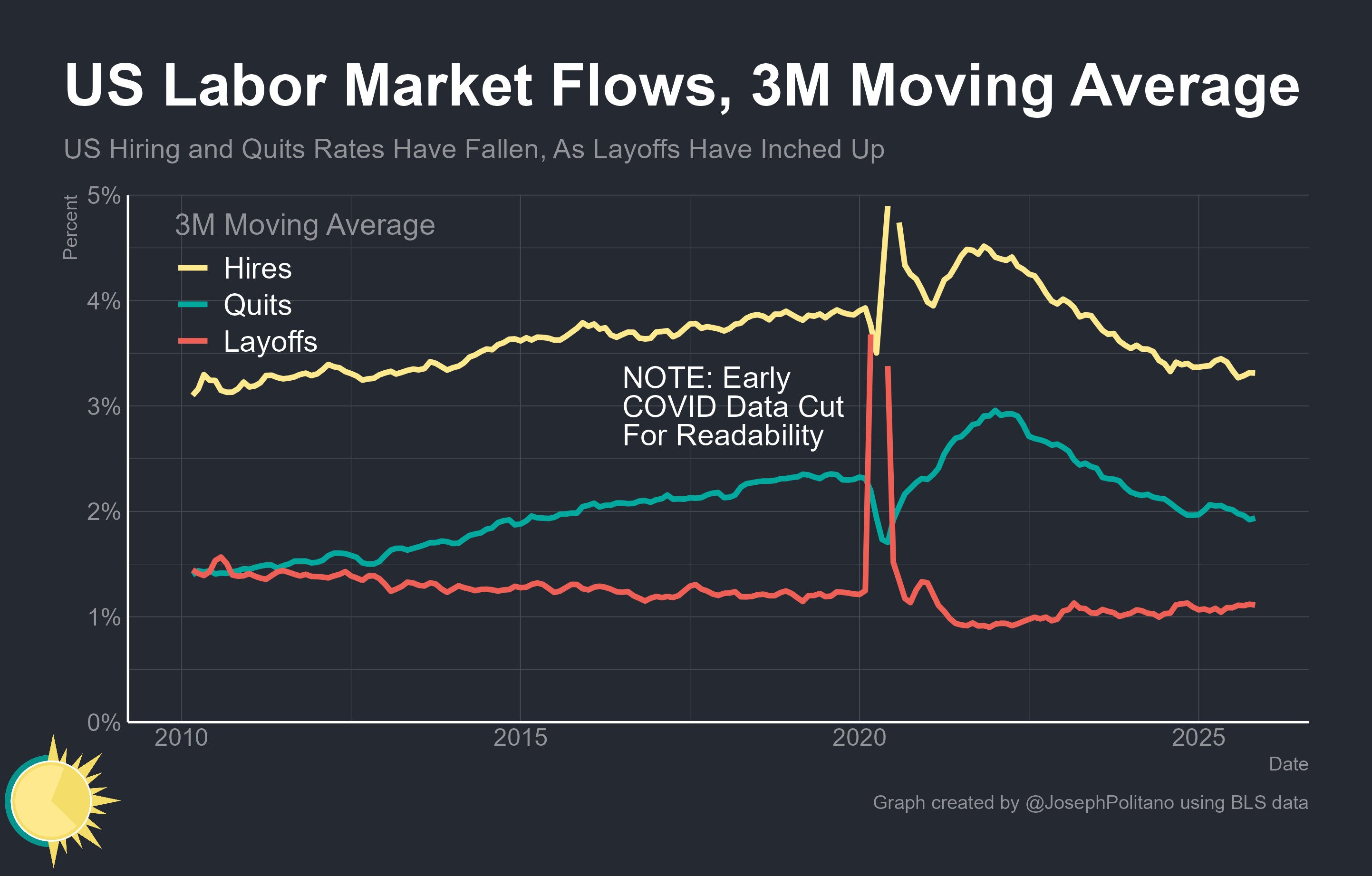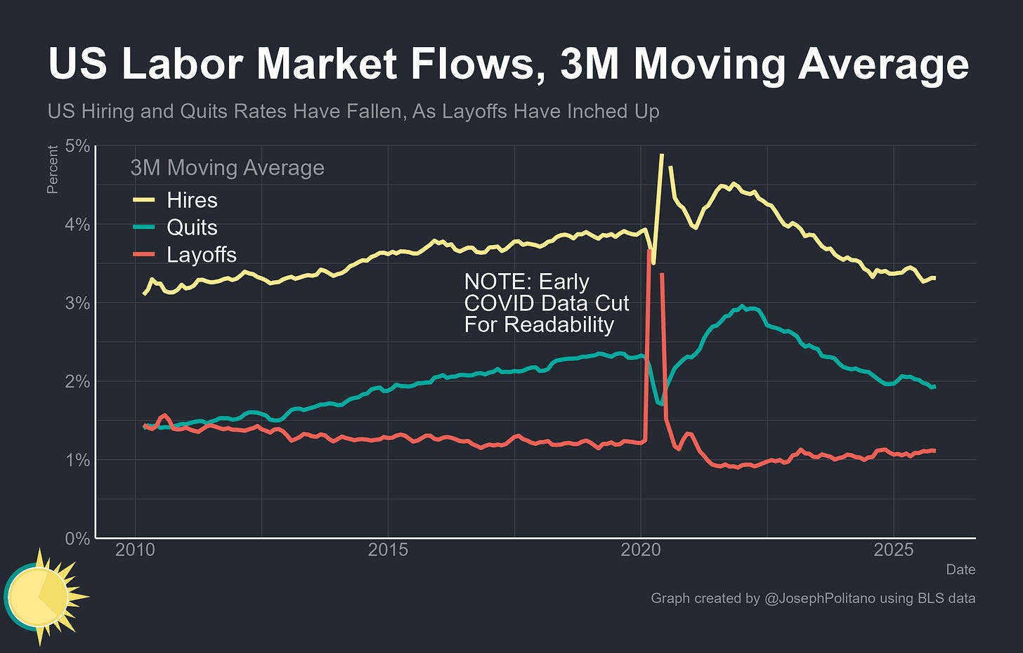 In 2021 and 2022, the US economy experienced the “Great Resignation” (or perhaps more accurately the “Great Reshuffling”), where tens of millions of workers quit their jobs and were hired into better-paid positions in other companies. Then, between 2023 and 2024, the US economy settled into a “low hire, low fire” equilibrium as employers were not onboarding many new workers, but were also laying off fewer workers than pre-pandemic. That has now given way to a “no-hire” economy—layoffs have inched up towards their pre-pandemic average, but hiring has sunk all the way down to 2013 levels.