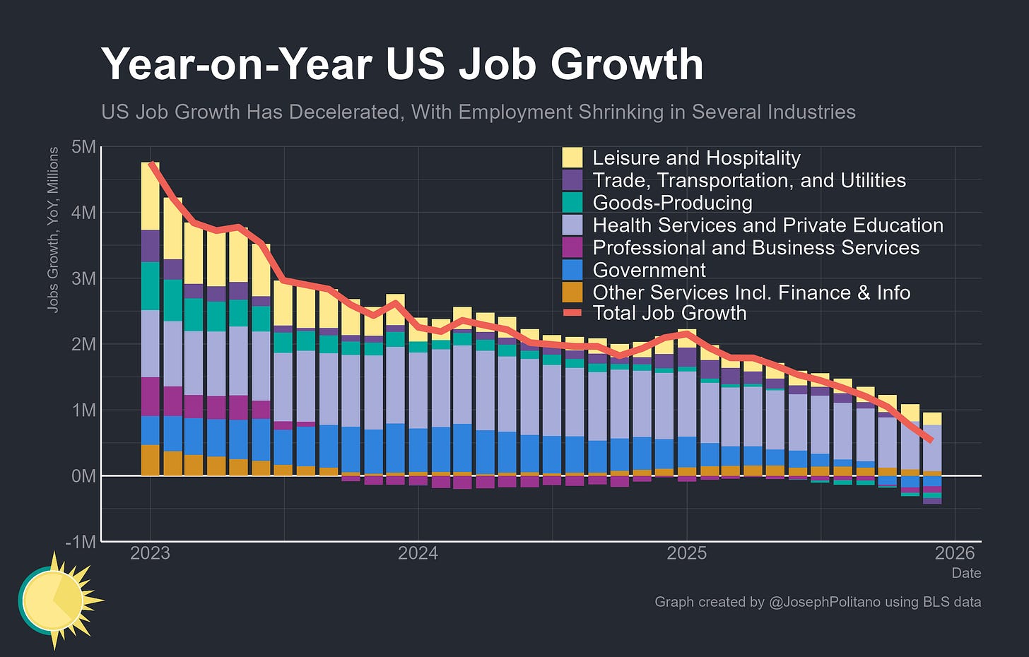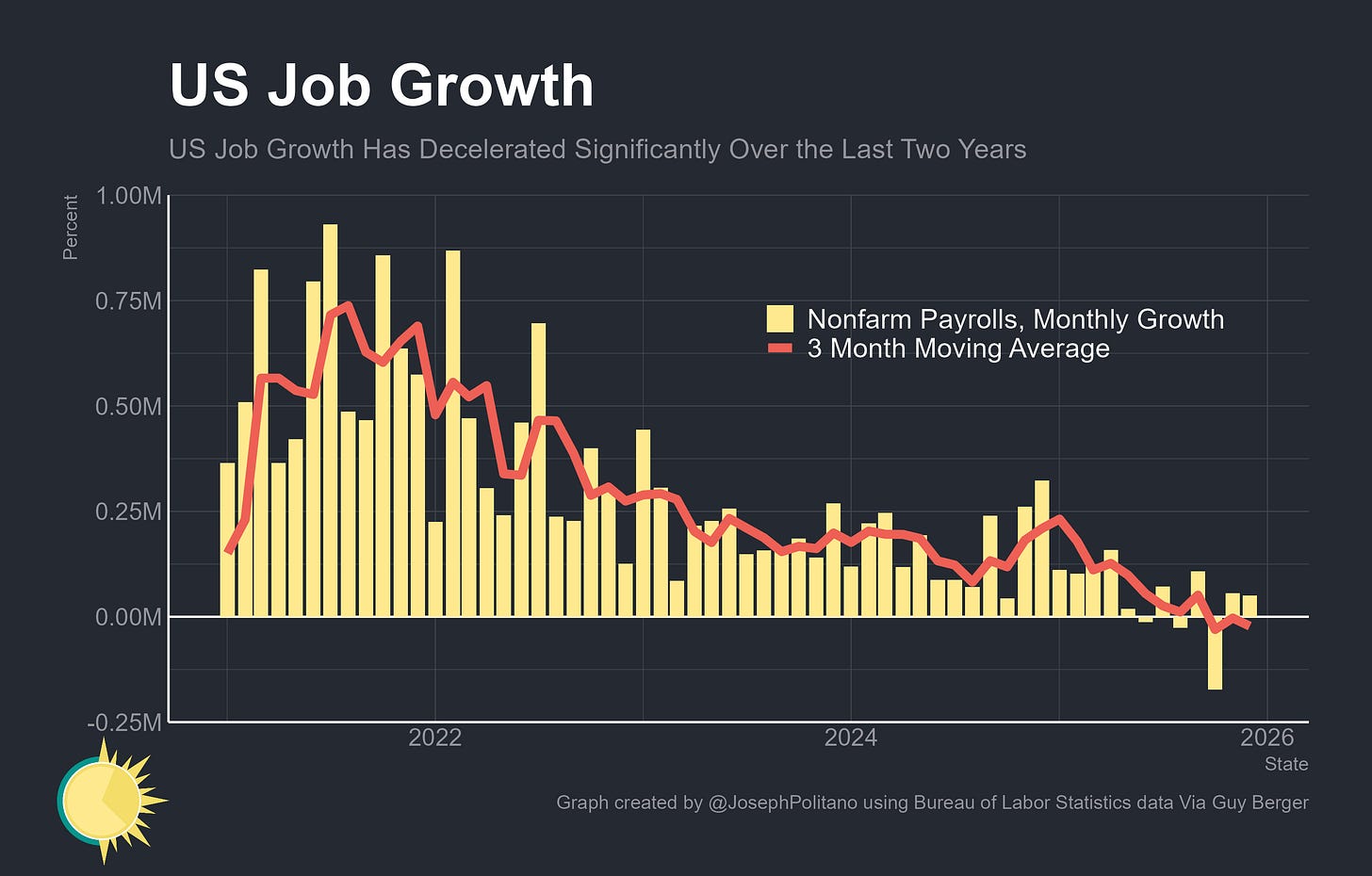 The US job market slowed down significantly in the latter half of 2025, with the country adding functionally zero jobs over the last 5 months as the unemployment rate ticked up to some of the highest levels since early 2021. Averaged across the entirety of 2025, the US added only 44k jobs per month, the lowest since 2020 and lower than any year during the 2010s. It’s a dramatic reversal for a labor market that was setting modern hiring records only a few years ago.