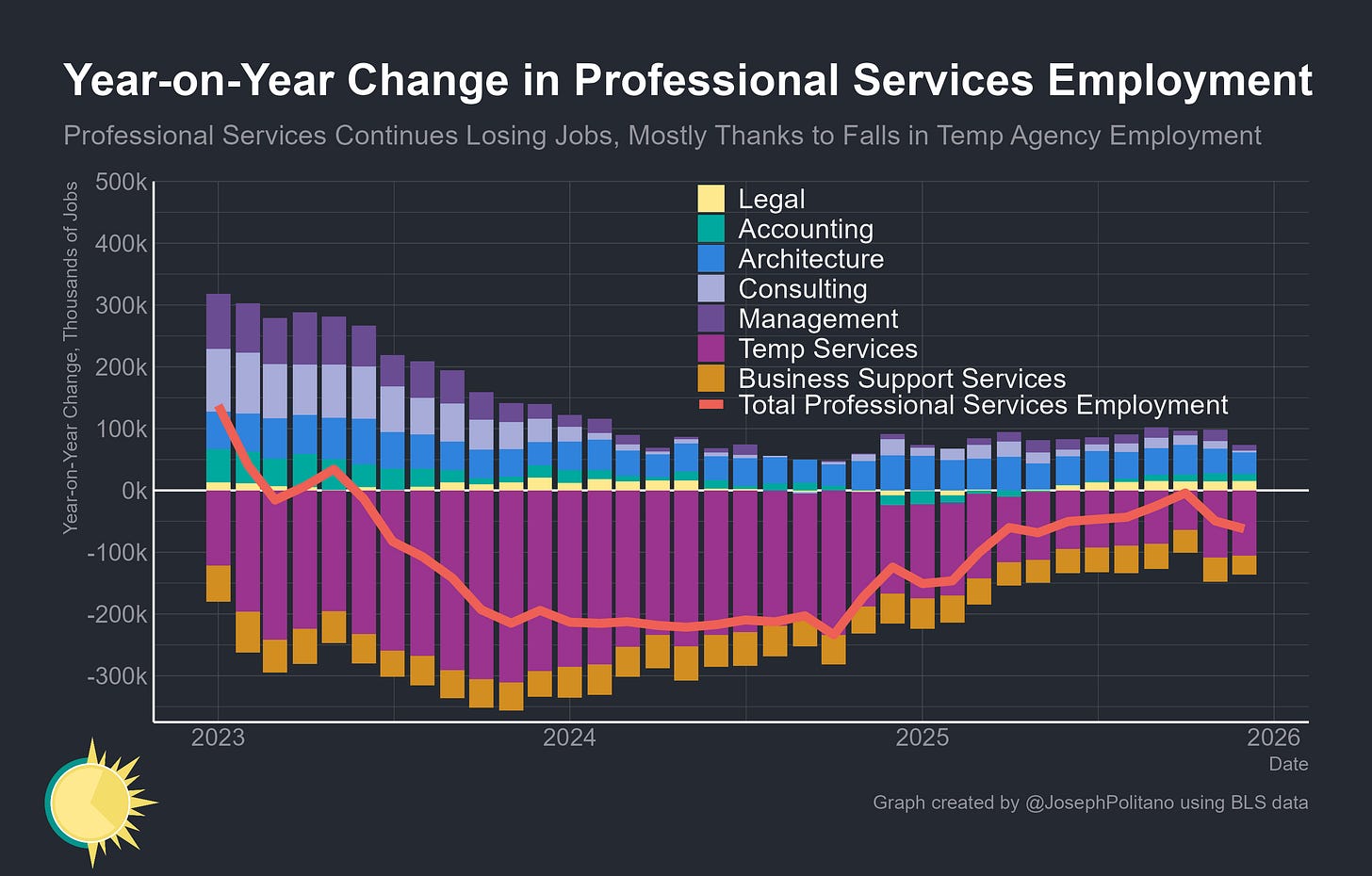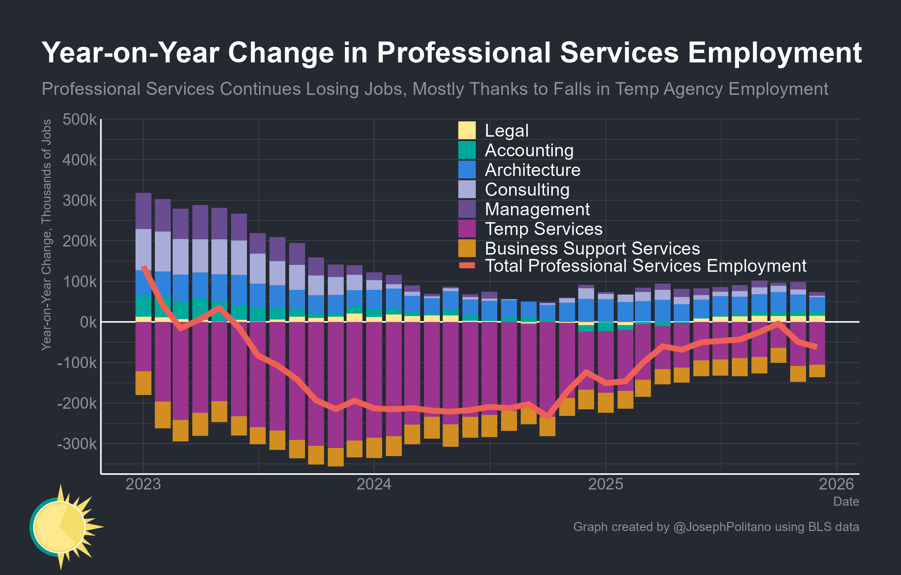 Job growth in professional services industries also remains negative, with employment shrinking by roughly 62k over the last year. The high-paid white-collar sectors like law, accounting, architecture, and management consulting are still adding jobs, just at a much slower rate than pre-COVID, but employment levels at temp agencies and administrative support firms have been continually declining for years now.