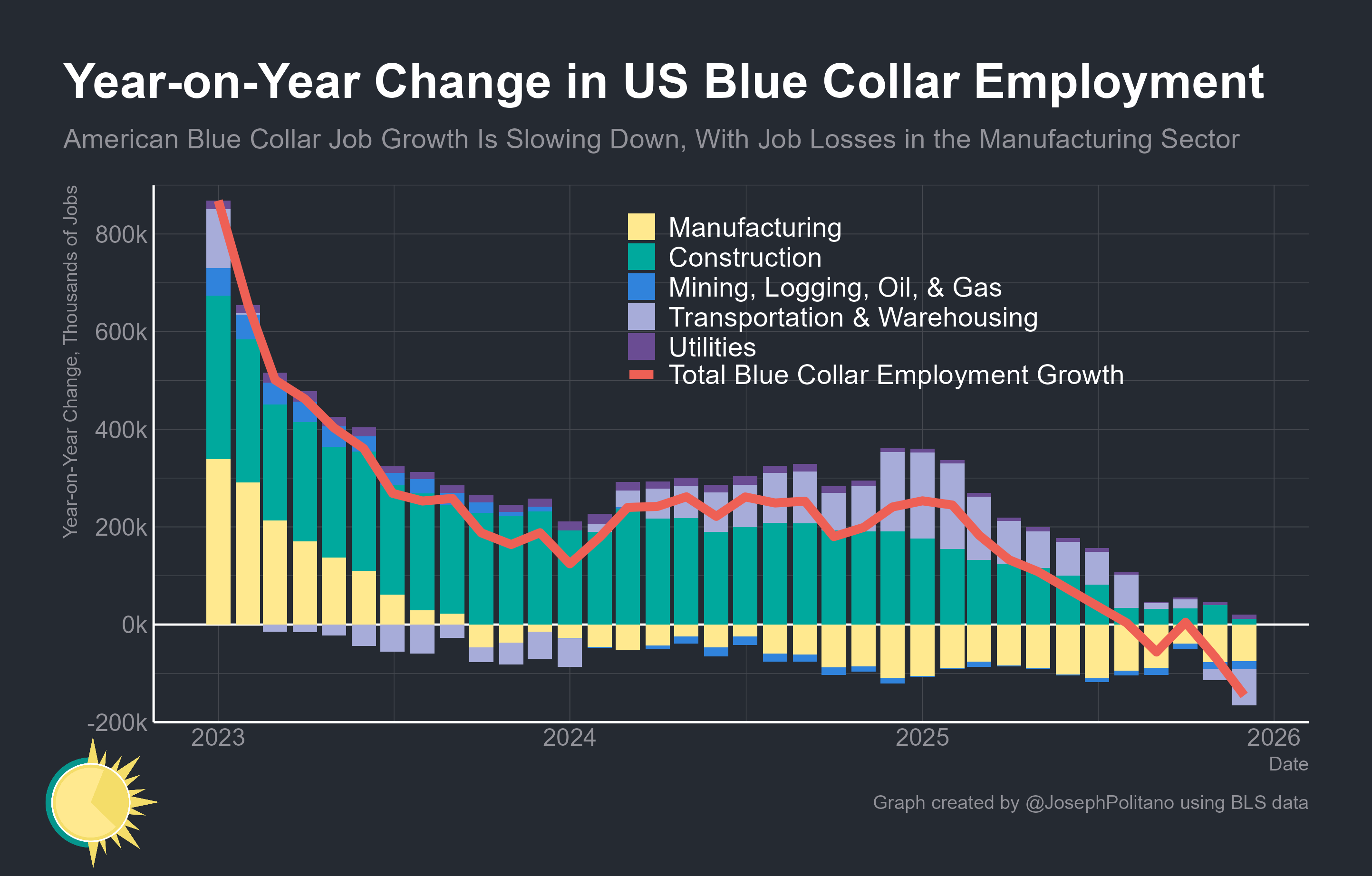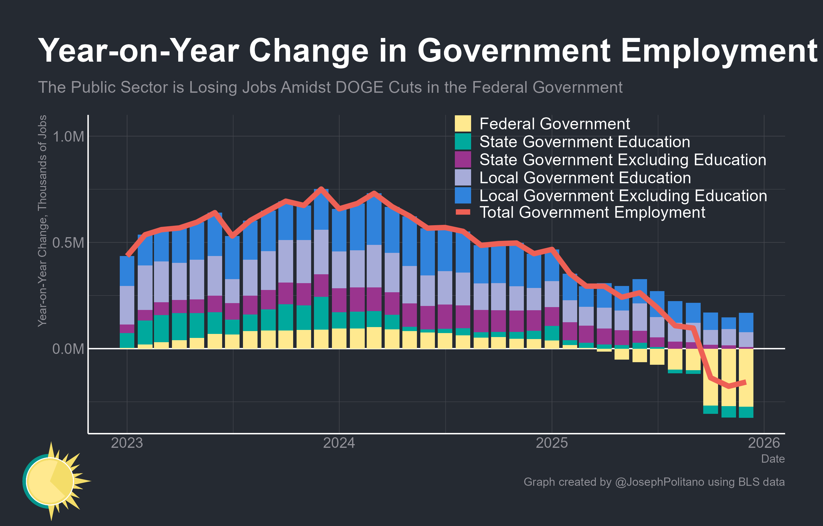 The 2025 slowdown in job growth is clearly not just a story about the US population shrinking amidst a rapid decline in immigration. We still don’t have good data on how many foreign-born workers have left the US since Trump’s immigration crackdown, but we do know that employment rates for native-born Americans are slowly falling. Nor is this entirely a story about AI-driven disemployment—sectors extremely insulated from computer technology are some of those with the fastest job declines.