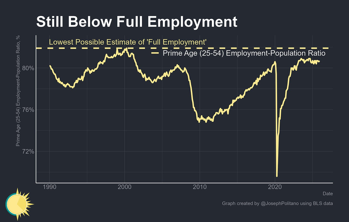 Today’s labor market is perhaps most reminiscent of the “jobless recovery” that characterized the early 1990s or mid-2000s, where employment rates remained stagnant even as overall economic growth had already rebounded. The nearly three-year period from February 2023 to the present is the longest time since those previous “jobless recoveries” where employment rates for prime-age workers have stayed within a one percentage point range, never declining below 80.4% and never rising above 80.9%—despite a more-than-7% increase in US GDP over the same timeframe.