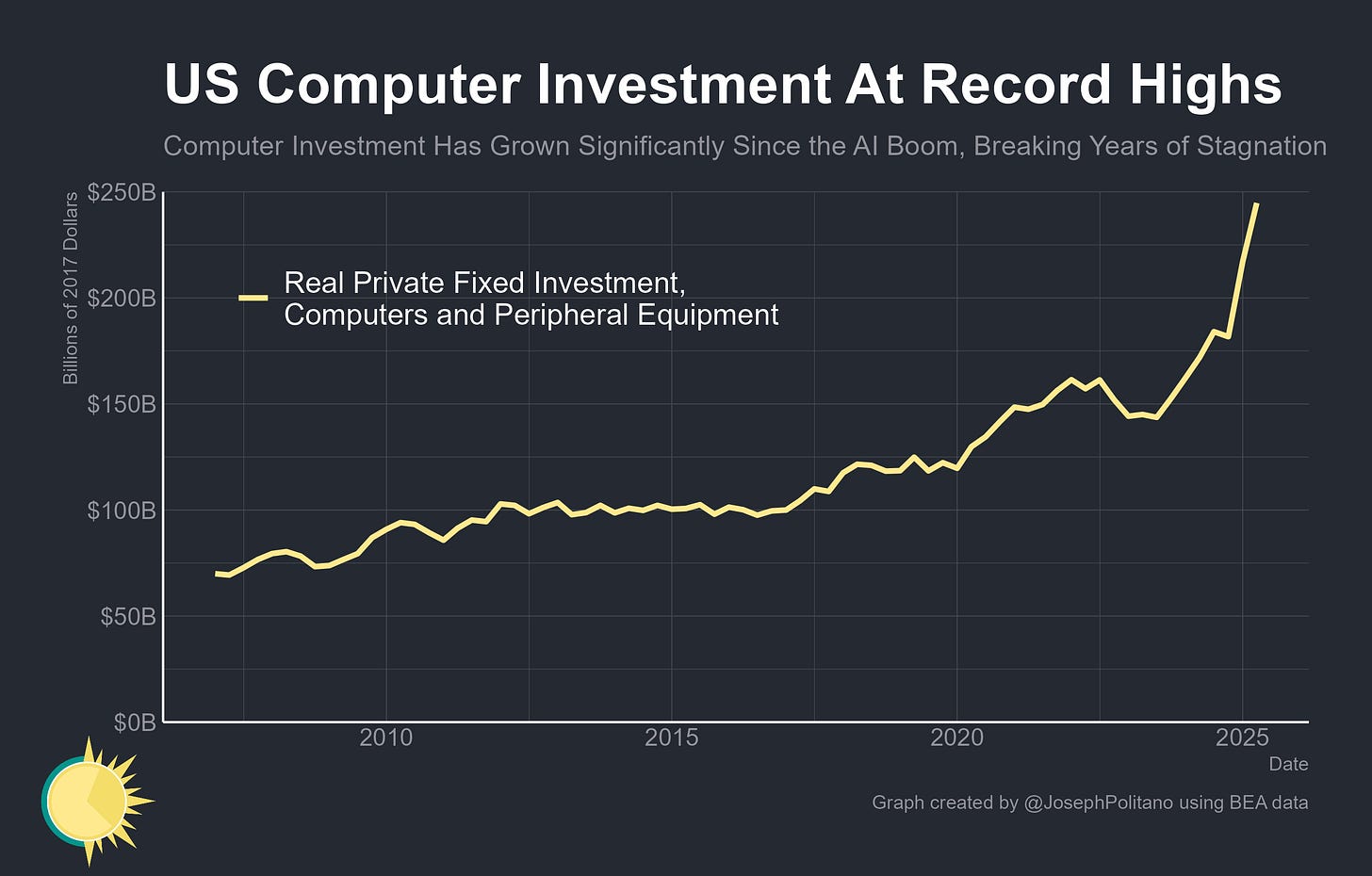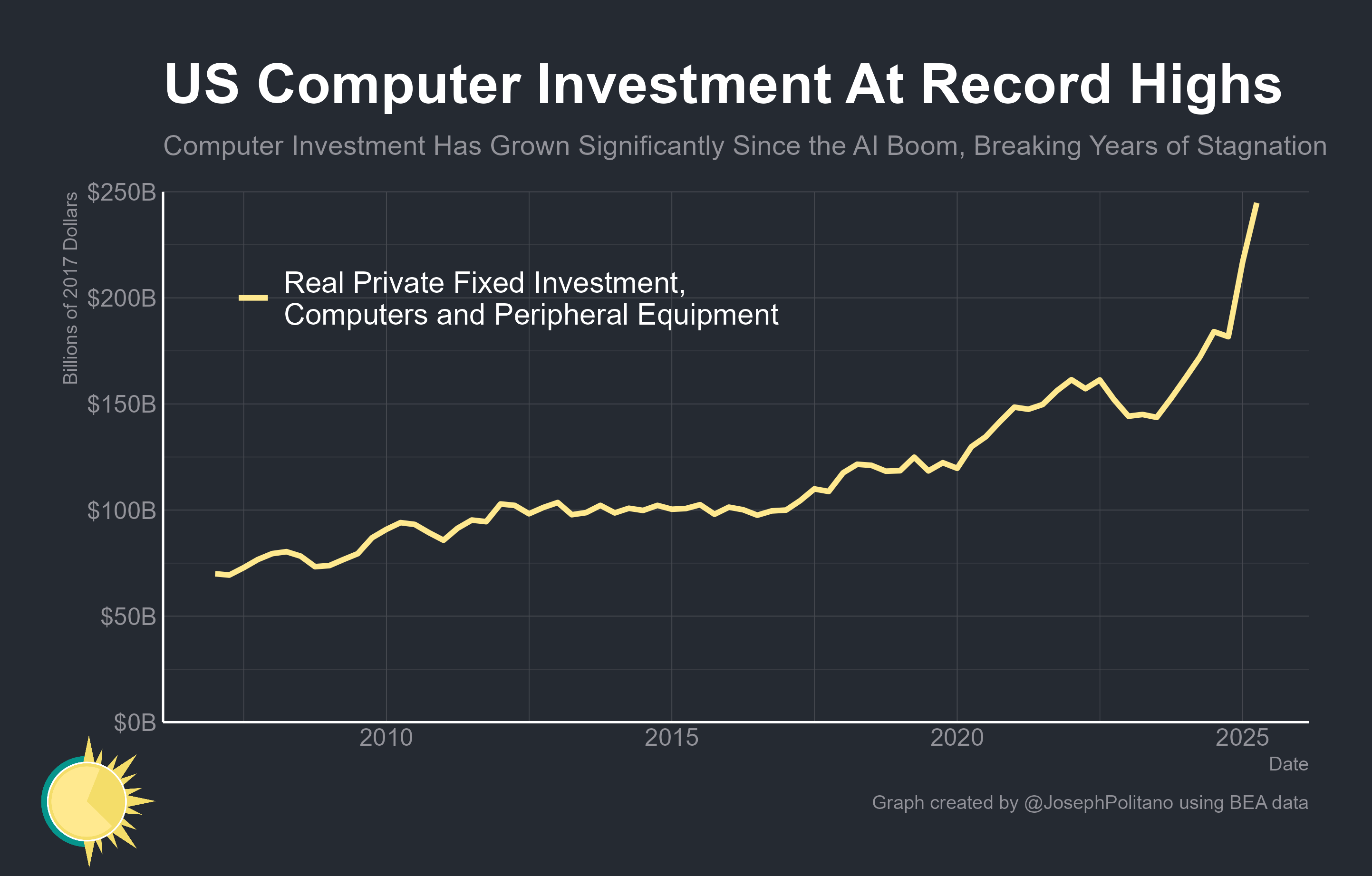 Yet those eye-popping numbers only reflect the facilities themselves, excluding the computers and other electronics housed inside. The brains of AI data centers are much more valuable than their skeletons, and thus US investment in computers & electronics far outstrips the amount spent on data centers alone. Fixed investment in computers & related equipment has risen to nearly $250B after adjusting for inflation, a record high and a nearly-$100B increase over the last year.