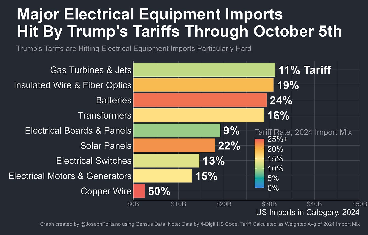 However, Trump has not exempted electricity generation infrastructure from tariffs like he has with data center computers. Transformers, batteries, switches, and more all face substantial tariffs, making it harder for power companies to meet the electricity demands of the AI boom. In fact, Trump is specifically targeting certain electrical equipment for extra-high tariffs—copper wiring faces a 50% tariff, generators face elevated tariffs based on their steel content, and the Department of Commerce has started an investigation into wind turbine imports that sets the stage for future tariffs. At the same time, the administration has been trying to forcibly cancel many clean energy projects by revoking their funding or permits, exemplified by the recent stalling of the nearly-complete Revolution Wind project in Rhode Island.