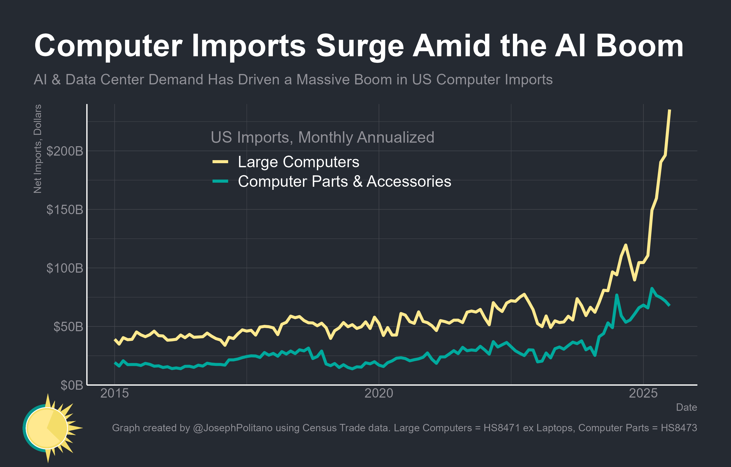American tech companies have been in a frenzy to develop increasingly advanced AI models ever since the release of ChatGPT in late 2022. Training and running these models require processing unprecedented levels of information, which in turn requires some of the largest data centers ever built, which themselves require thousands of advanced computers to operate. However, the modern electronics used in data centers have the most complex supply chains in human history, and America makes up only a small part of the direct manufacturing involved. Thus, imports of the large computers commonly found in data centers now exceed $235B annualized, up 227% compared to before the launch of ChatGPT, while imports of computer parts exceed $67B annualized, up more than 100%. Without this exemption, importers would have paid an extra roughly $8.9B so far this year (naively applying the 10% baseline tariff rate that has been in place since April), or roughly $19.2B (applying the country-level tariff rates in place as of today). The current AI boom would simply be impossible if tech companies had to pay the same tariffs that car manufacturers or homebuilders currently face.
