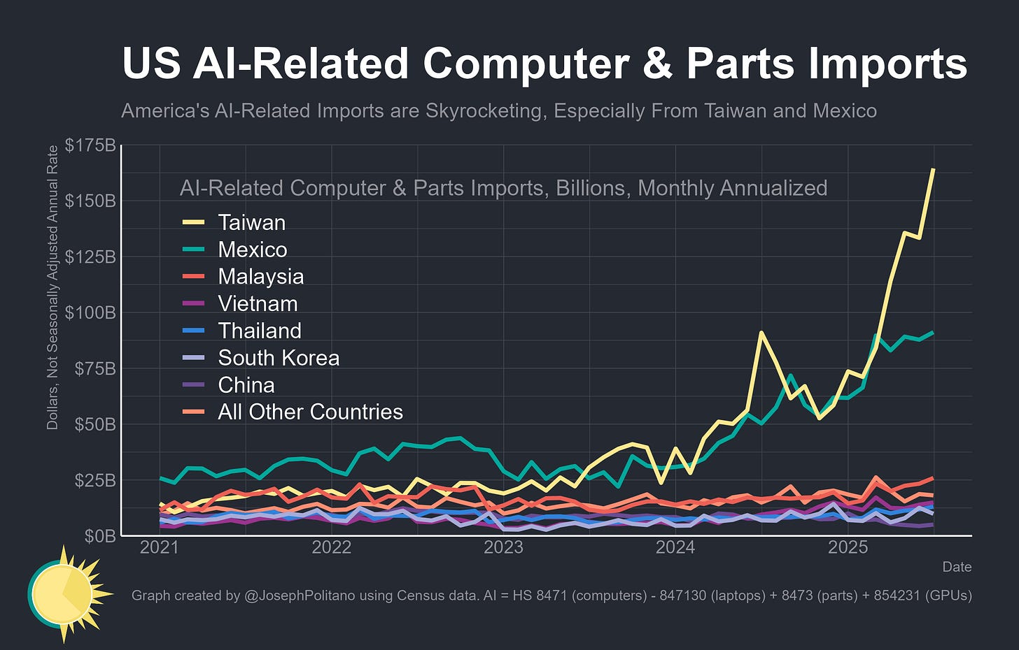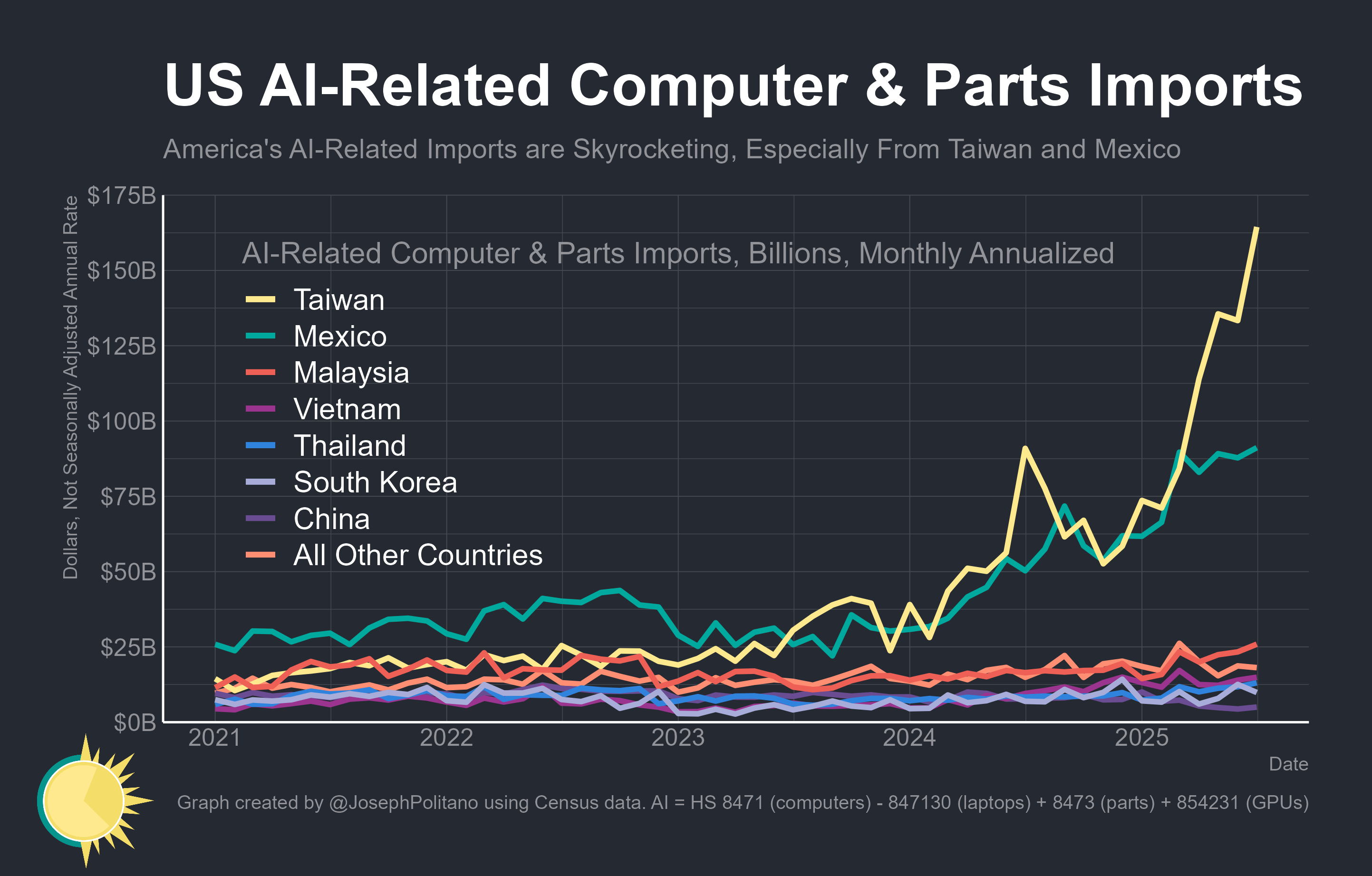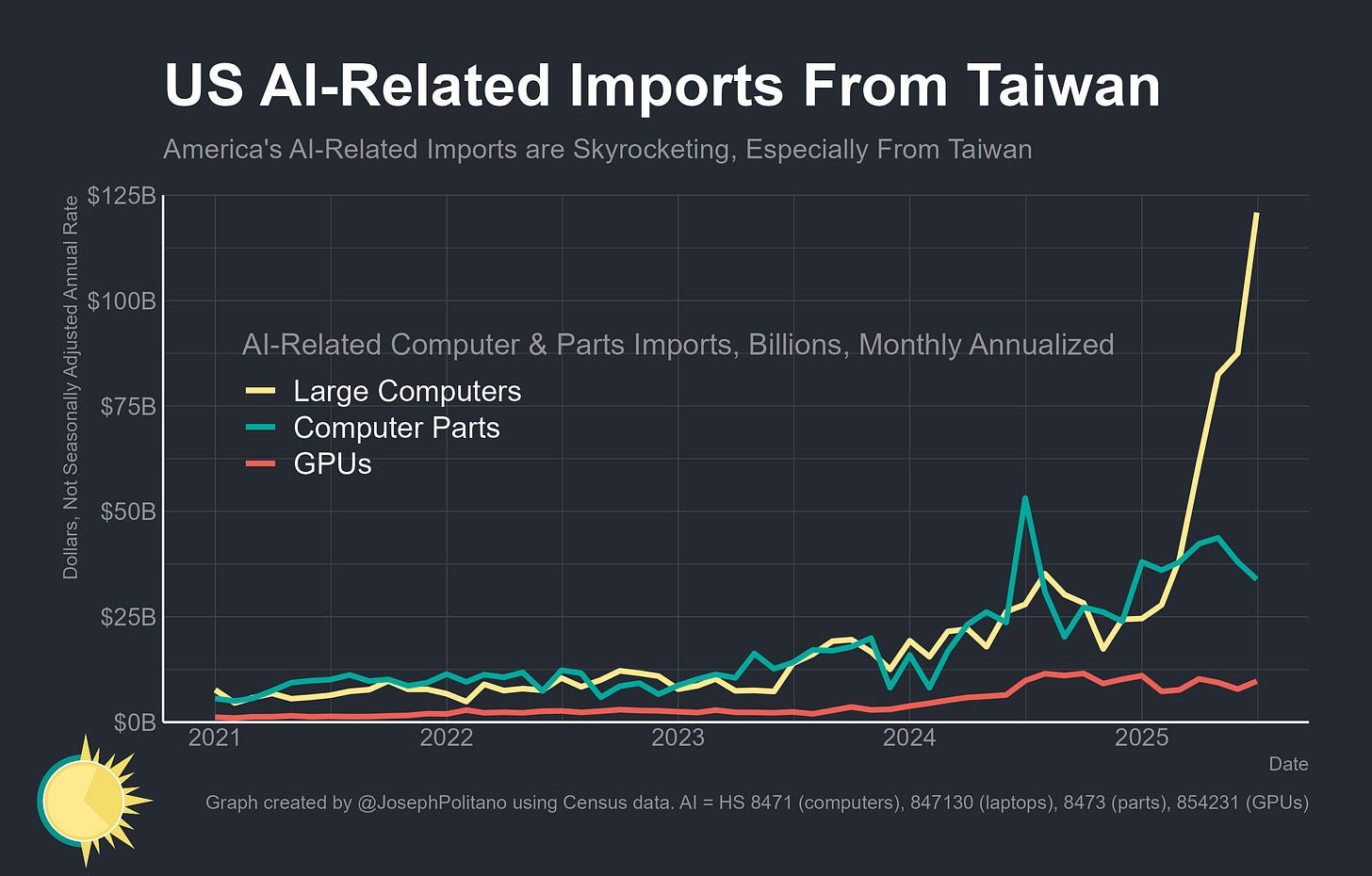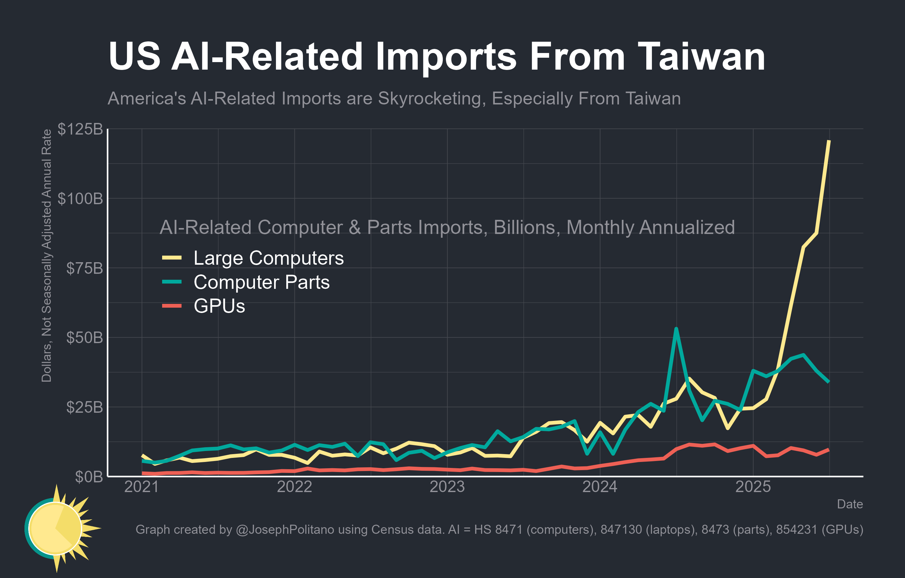Breaking down the trade with Taiwan, the vast majority of imports come in the form of larger computer systems designed to slot into the server racks of American data centers. Those imports have nearly quintupled since the beginning of the year as companies rush to bring as many computers as possible into the country. Data centers also rely on a complex array of parts for their regular operation, and imports of the specialized parts made by companies like TSMC have risen to roughly $30B annualized. Imports of GPUs themselves have also increased significantly, although they make up only a small share of direct US-Taiwan trade—most GPUs are already assembled into computers before boarding ships for America.