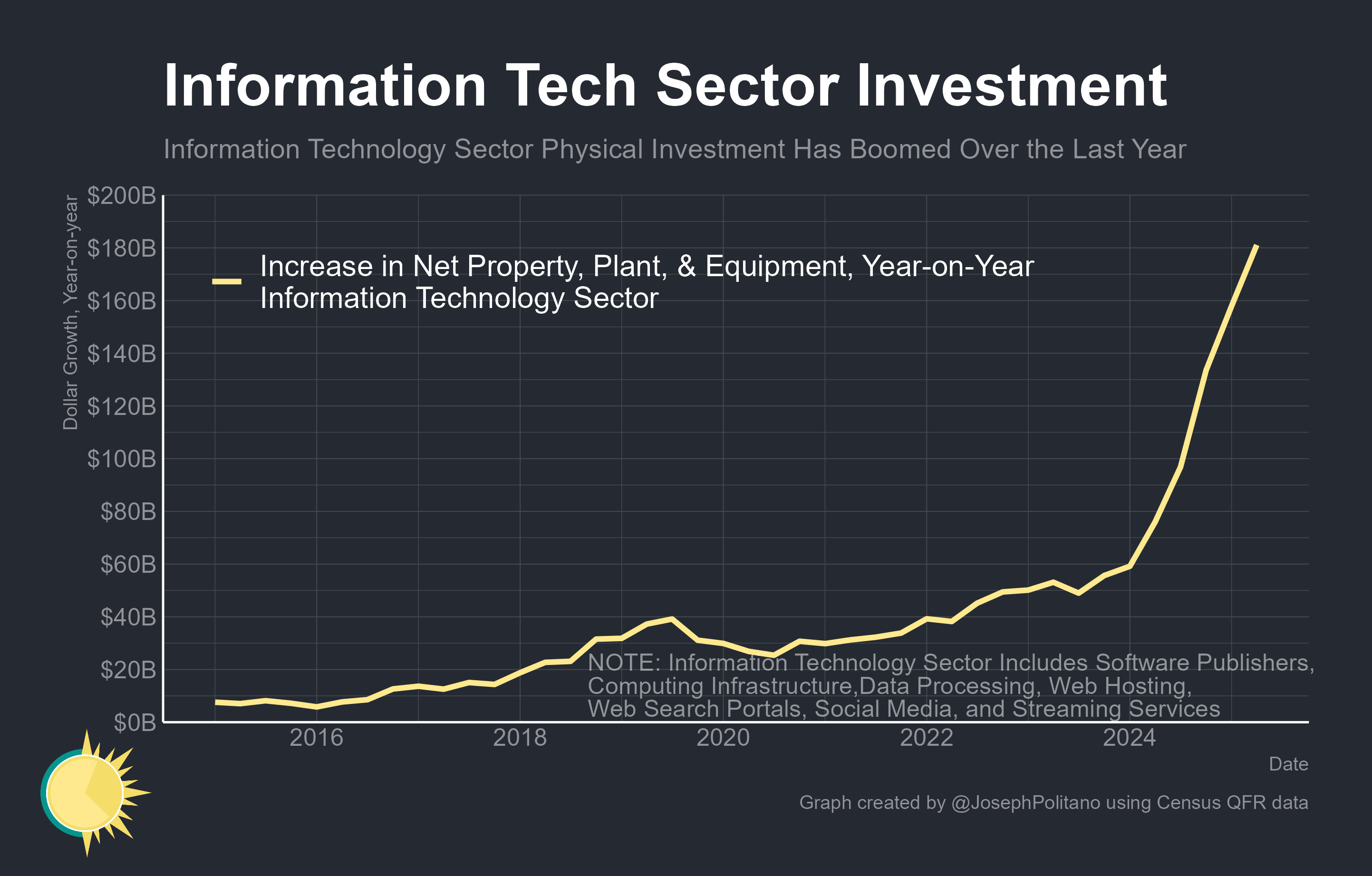 It’s hard to know precisely how much of that investment is directly attributable to AI—after all, computers & data centers are used for a wide variety of digital tasks, including video streaming, cloud storage, data management, etc—but we can get a better idea by looking at the spending of tech companies specifically. Businesses in the information technology sector have increased their holdings of property, plants, & equipment by more than $180B over the last year, a record high that is more than triple the 2023 pace.