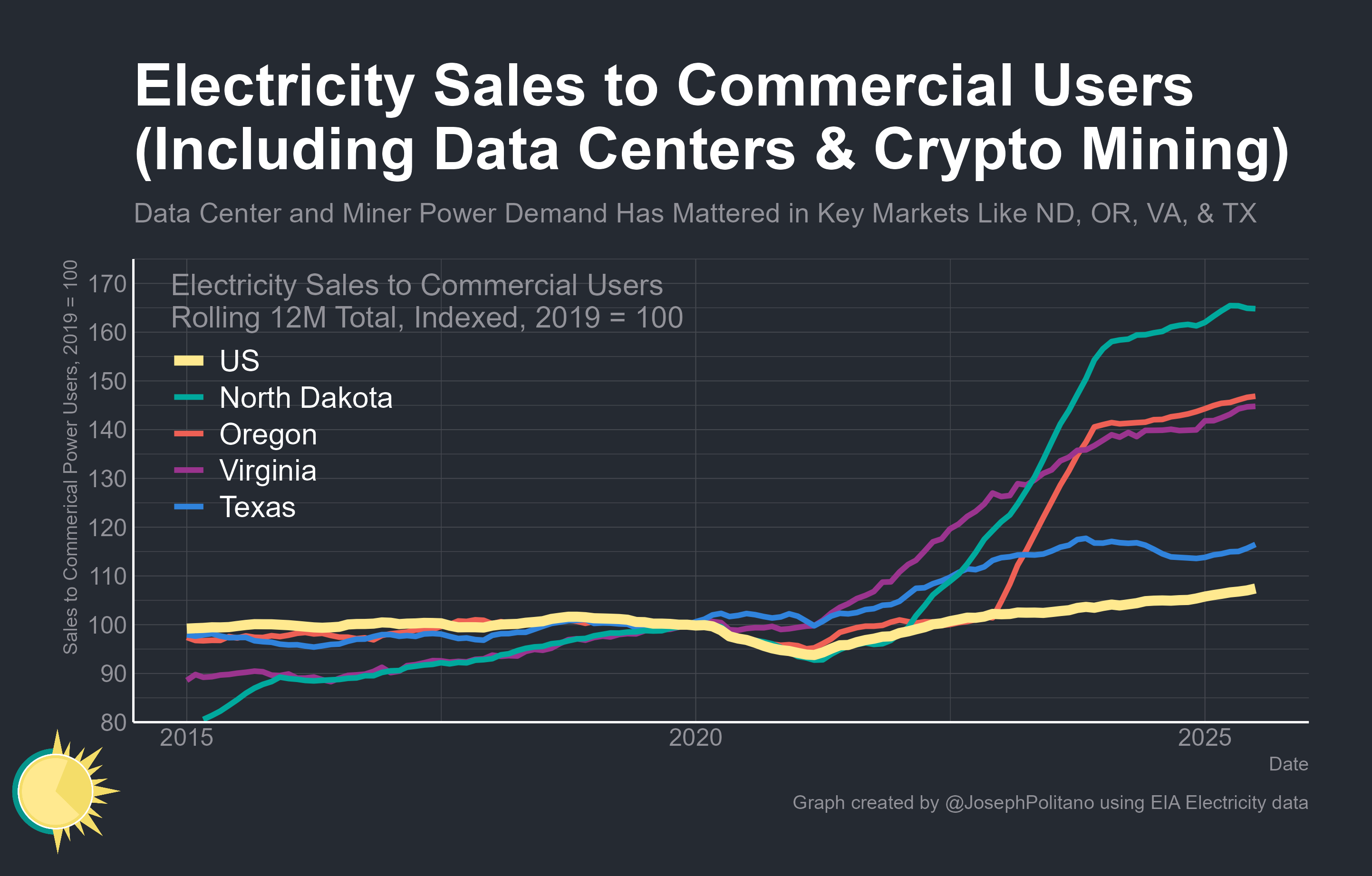 The other key issue is that data centers are not just dependent on electronics themselves, they are also dependent on electrical infrastructure for the industrial-scale power required to run modern AI models. Electricity sales to commercial users (which includes data centers) have risen by roughly 7% since 2020, making it the largest contributor to overall US load growth ahead of residential and industrial sales. Yet in specific submarkets, the impact of data centers has been much, much larger—annual commercial electricity consumption in Virginia has risen by roughly 45% (24 TWh) since 2019 as the megacluster “Data Center Alley” continues to grow in the DC exurbs. Oregon has seen a similar 47% (8 TWh) spike in commercial power consumption, Texas has also seen a more than 16% (21 TWh) increase, and tiny North Dakota has seen a 65% increase (4.6 TWh) after the construction of a handful of data centers.