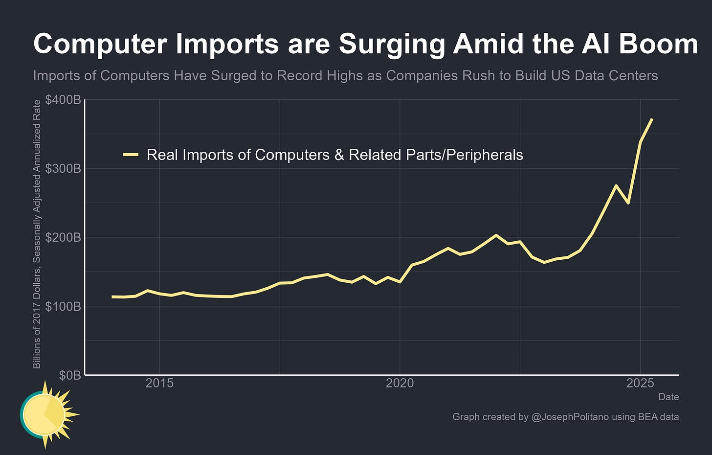 That rising data center investment requires record amounts of foreign inputs since advanced computer manufacturing is a highly complex and extremely globalized industry. The AI investment boom is dependent on imports of GPUs, computers, parts, and other electronic equipment from countries like Taiwan, Mexico, and Vietnam. Those imports are now skyrocketing, reaching more than $370B annualized after adjusting for inflation, and show little signs of slowing down.
