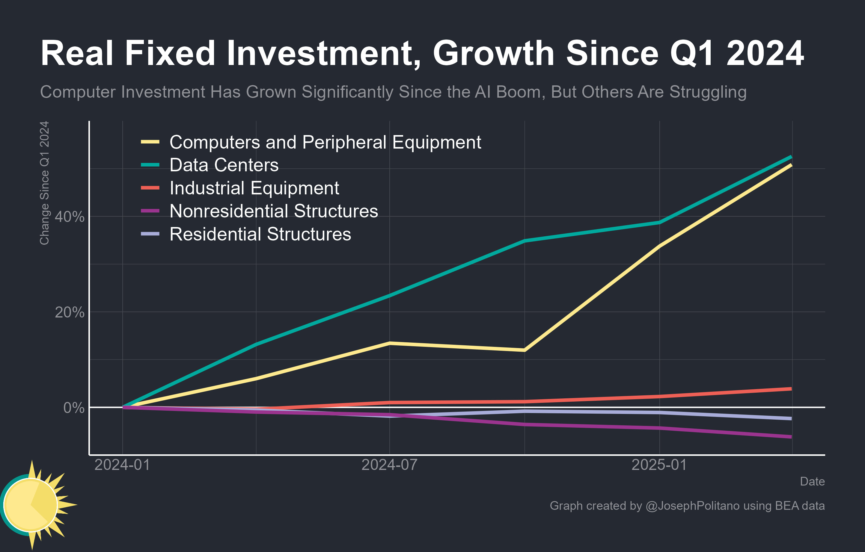 Heavy tariffs are a form of industrial policy, allowing the government to intervene directly in the economy to support certain sectors at the expense of others. That primarily happens through supply channels—American aluminum manufacturers currently enjoy massive government support via the 50% tariffs on aluminum while the downstream airplane manufacturers reliant on aluminum suffer higher input costs. Yet tariffs and their exemptions can also shape investment decisions by changing the relative price of capital goods—right now, it is much more expensive to build an aerospace manufacturing plant relative to a data center because only the plant’s equipment will be hit with tariffs. Real US investment in structures has sunk since the beginning of this year while investment in industrial equipment grew tepidly; only tariff-exempt electronics investment is booming.